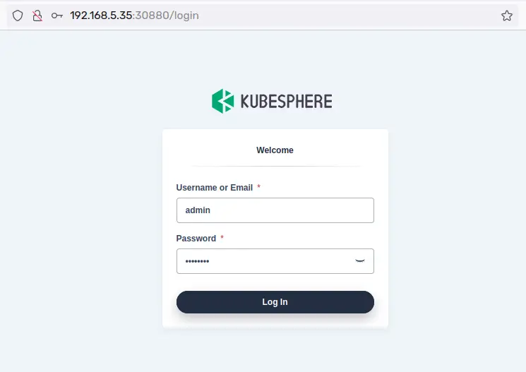 Now open your web browser and visit the 'master' server IP address followed by port '30880' (i.e: http://192.168.5.35:30880/). You should see the Kubepshre login page.