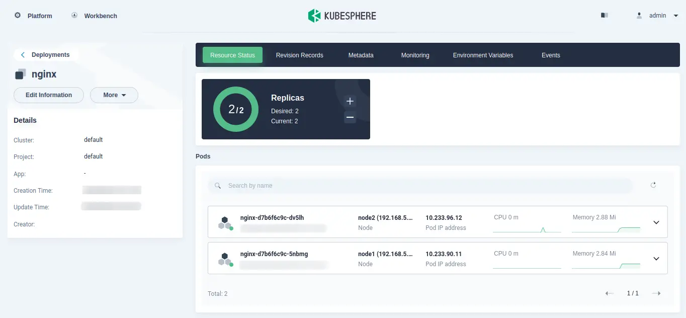 With this, you have now finished the deployment of Nginx pods to the Kubernetes cluster and verified the details of deployment from the kubesphere administration dashboard.