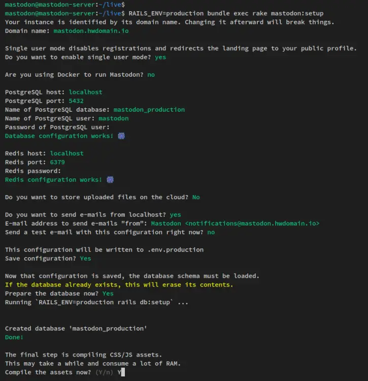 - Setup admin user? Input the new admin user and email for your Mastodon installation. And you'll then get the password generated automatically to your screen.