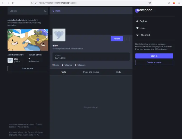 Open up your web browser and visit the domain name of your Mastodon installation (i.e: https://mastodon.howtoforge.local/). You'll now see the default homepage of Mastodon.