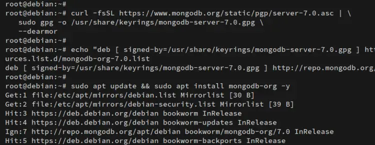 Now add the MongoDB GPG key and repository for Debian with the command below. In this case, you'll set up a repository for MongoDB 7.0.