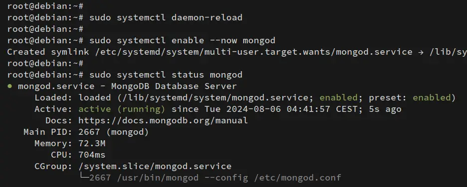 Start and enable the 'mongod' service, then verify it to ensure that the service is running.
