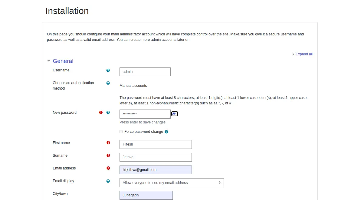 Provide your Moodle web address, directory path, data directory path and click on the Next. You should see the following page: