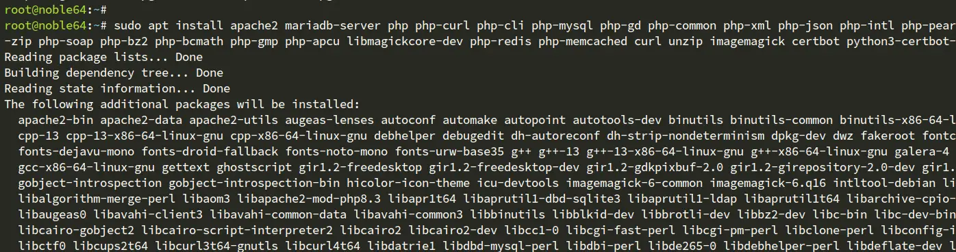 sudo apt install apache2 mariadb-server php php-curl php-cli php-mysql php-gd php-common php-xml php-json php-intl php-pear php-imagick php-dev php-common php-mbstring php-zip php-soap php-bz2 php-bcmath php-gmp php-apcu libmagickcore-dev php-redis php-memcached curl unzip imagemagick certbot python3-certbot-apache