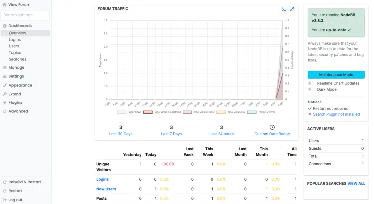 Click on the Login link and you’ll be prompted with the NodeBB login page. Then, enter your admin user and password, and click Login to confirm. If you have the correct credentials, you’ll see the following admin dashboard.