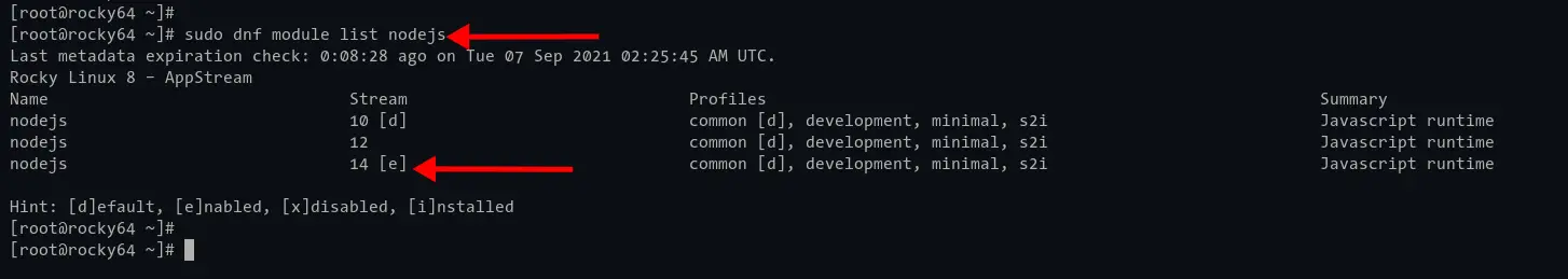 By default, Rocky Linux provides a repository module for Node.js. They provide 3 different versions of Node.js, and all of those are LTS (Long Term Supports) versions. If you want to install Node.js-based applications on the server for long-term usage and not for development, then this is recommended way. But if your applications need a specific version of Node.js, then you go to the second method.