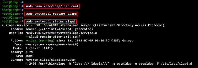 Now run the command below to restart the "slapd" OpenLDAP service and apply new changes on the OpenLDAP server. The OpenLDAP server is now running with the base DN "dc=localdomain,dc=com".