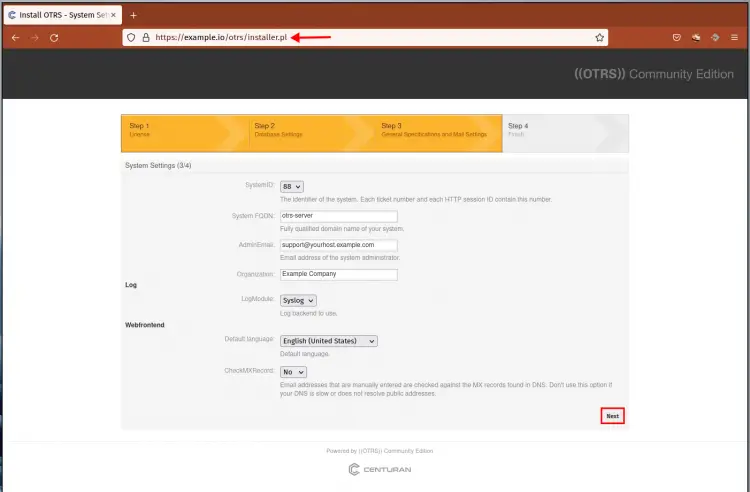 5. For the OTRS general configuration, leave it as default and click 'Next'.