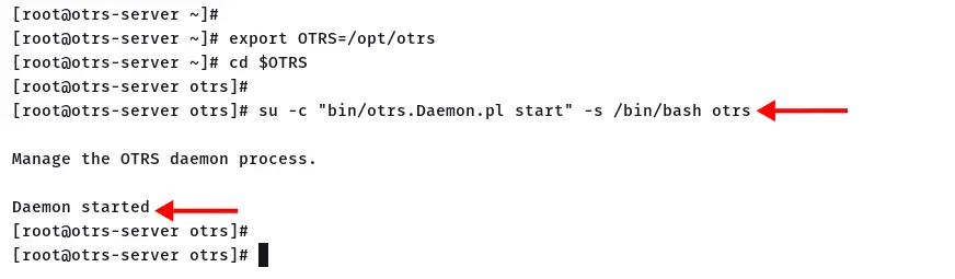 1. Change the working directory to '/opt/otrs' and start the OTRS daemon script. Ensure the OTRS daemon script running as a user 'otrs'.