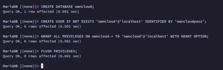 In this step, you will install the MariaDB database server, secure the MariaDB via the 'mysql_secure_installation' tool, and create a new database and user for ownCloud deployment.