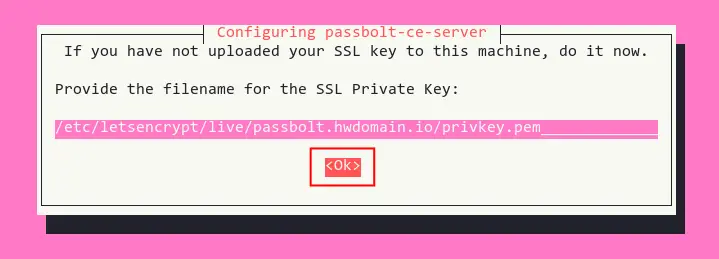 Now input the domain name for your Passbolt installation and select Ok. In this example, the domain will be "passbolt.howtoforge.local" that will be used.