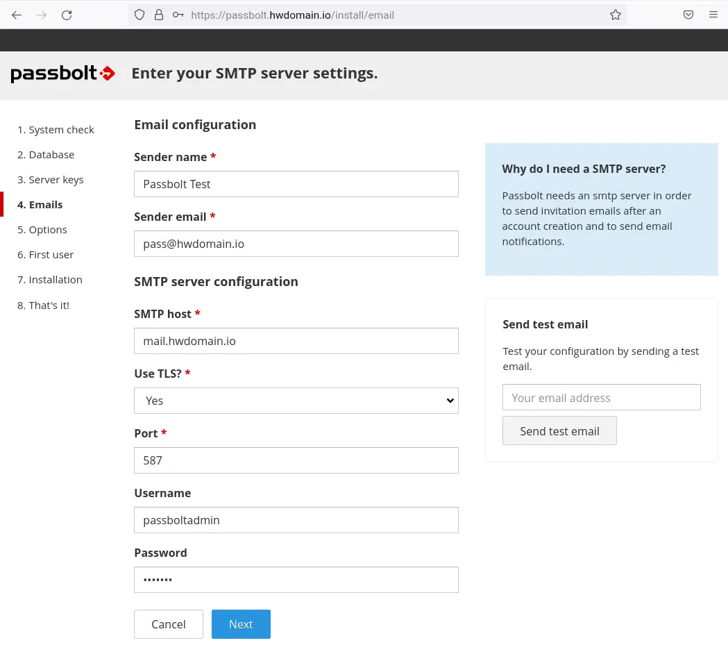You will now need to set up the SMTP server configuration. This will be used if you want to invite people to Passbolt.