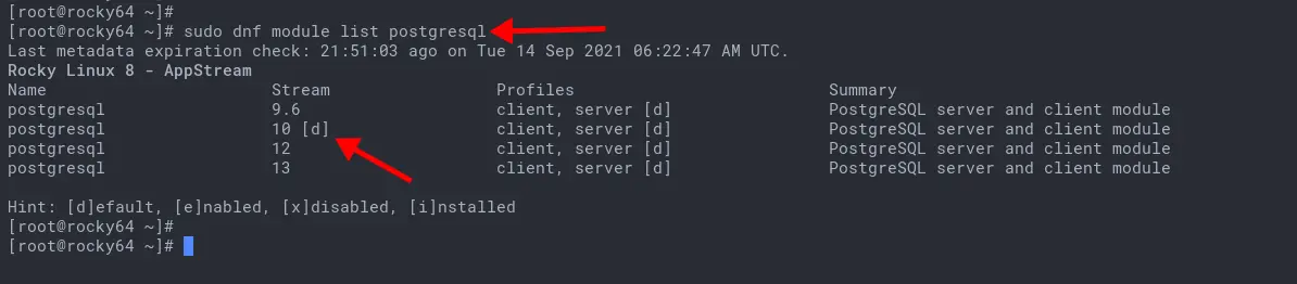 1. By default, the Rocky Linux repository provides multiple versions of PostgreSQL packages, the PostgreSQL 10, 12, and 13.