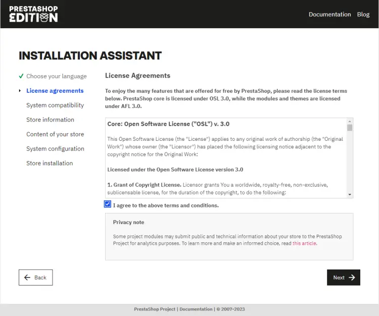 You will be shown the Prestashop License. Check the I agree to the above terms and conditions button to agree to the license and click Next to proceed.
