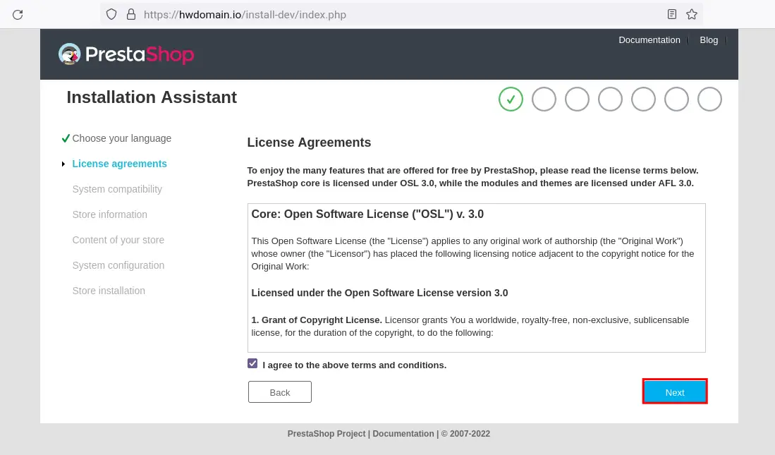 Select the default language for your PrestaShop installation and click Next. The default installation language for PrestaShop is 'English'.