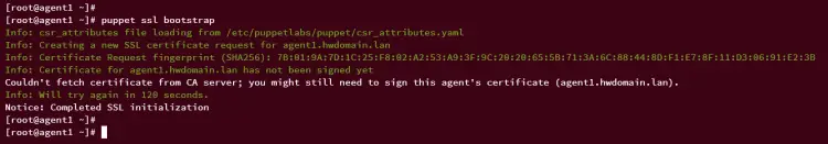 Then on the Puppet Agent machine, you should see the message "Notice: Completed SSL initialization".
