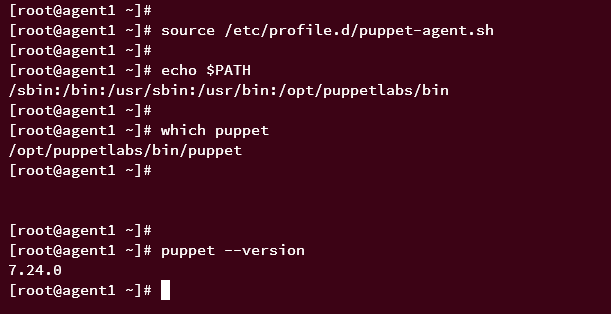 After puppet-agent is installed, run the following command to load the Puppet system profile to your current session. Then, check the system PATH environment variable.
