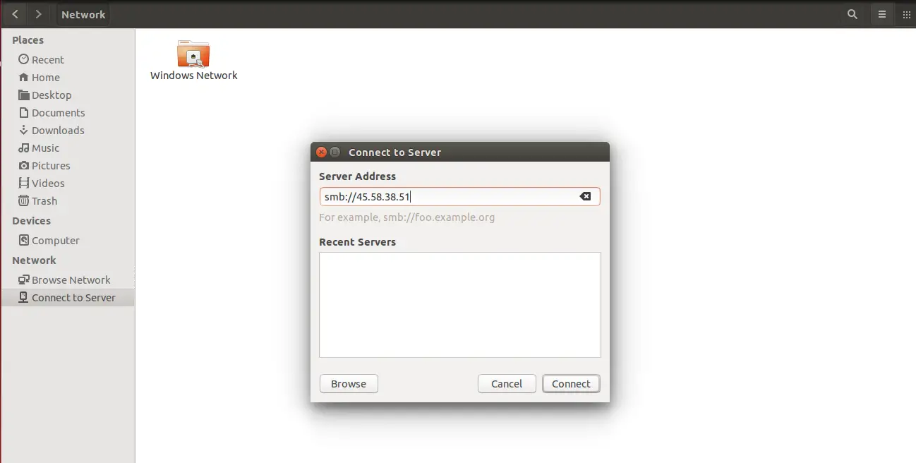 To access the Samba share, go to the remote machine, open the Gnome file manager and click on the Connect to Server as shown below: