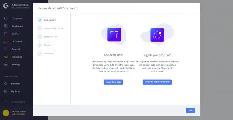 Provide your shop name, email, country, admin email, admin username, password and click on the Next button. You will be redirected to the Shopware dashboard screen: