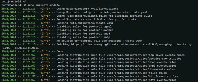 Congratulations! You've completed the installation of Suricata IDS on the Ubuntu 24.04 server. You've learned two methods to install Suricata, compiling manually from the source and via the APT package manager. You also have learned how to configure Suricata, update suricata signatures and rules, and test suricata rules.