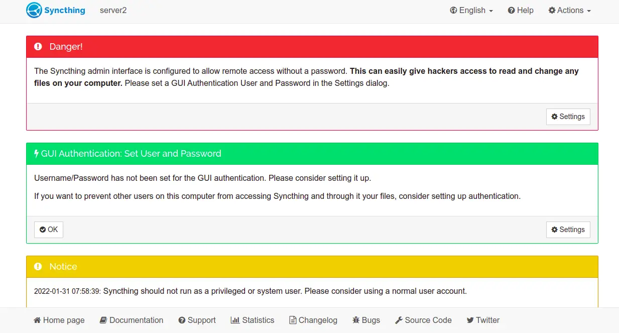 At this point, Syncthing is installed and running on both servers. Now, you will need to access the Syncthing web UI and set an admin password.