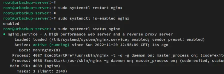 You will receive output similar to this - The urBackup service 'urbackupsrv' is running and enabled. The urBackup service will be run automatically upon the bootup.