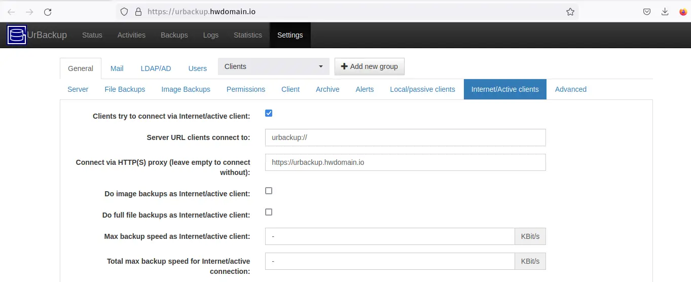 Still on the 'General' section, but move to the tab 'Internet/Active clients'. Then, input the urBacup domain name to the option 'Connect via HTTP(S) proxy', and click 'Save' again.