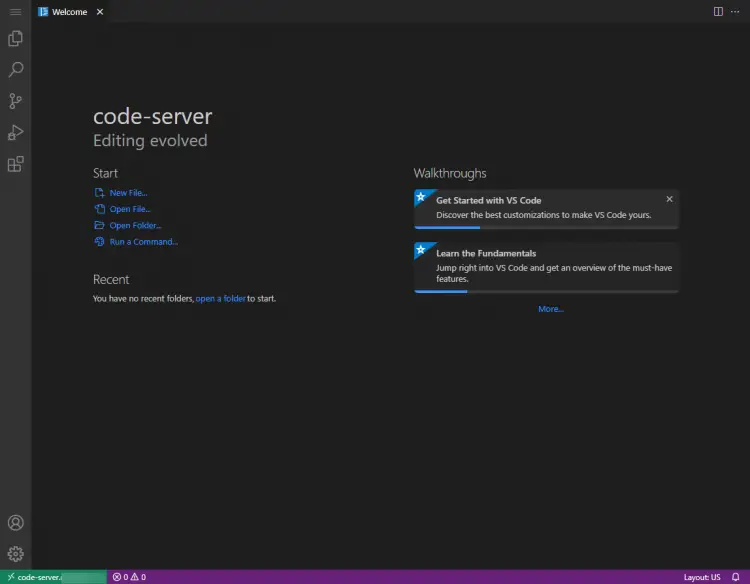 If you want to update your instance of code-server, repeat the installation process. code-server will preserve your files and settings.
