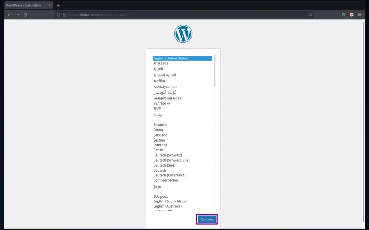 Select the language for your WordPress installation, the default is "English (united states)", then click "Continue".