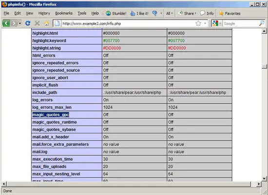 Then call the info.php script again in a browser (http://www.example2.com/info.php) and search for the magic_quotes_gpc line - it should show Off now: