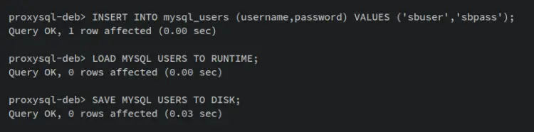 Now enter the following queries to confirm and save the changes on your ProxySQL server. With this, your new user is ready and you can use this MySQL user for your applications.
