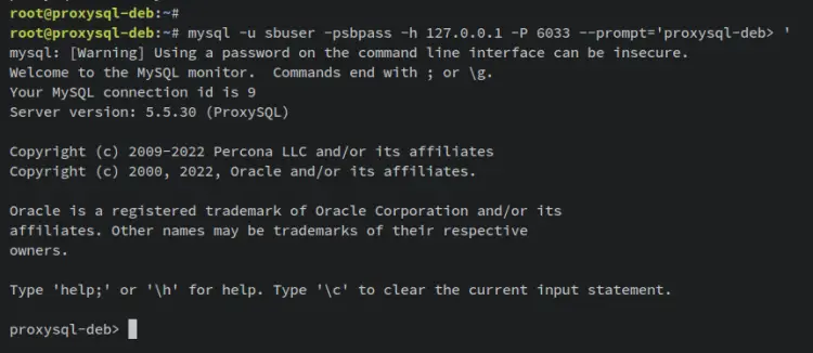 mysql -u sbuser -psbpass -h 127.0.0.1 -P 6033 --prompt='proxysql-deb> '