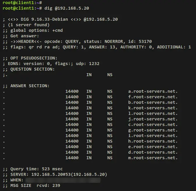Run the dig command below to ensure that the Unbound DNS is working as a DNS resolver. The parameter '@192.168.5.20' ensures you're using an Unbound DNS server that runs on IP address '192.168.5.20'.