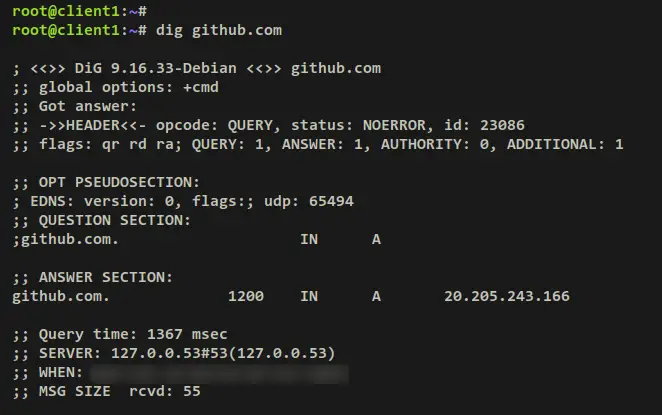 When successful, you should receive an output details DNS record for the domain 'github.com' and 'duckduckgo.com'. You can see the DNS resolver that answers the query is '127.0.0.53#53', which is the systemd-resolved that uses Unbound as the default resolver. Also, you can see the 'Query time' for each query, the 'Query time' to domain 'github.com' is '1367' and to 'duckduckgo.com' is '1059'.