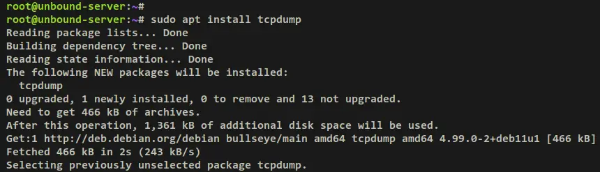 Lastly, you can also verify DoT (DNS over TLS) via tcpdump. Install the 'tcpdump' package to your Unbound server.