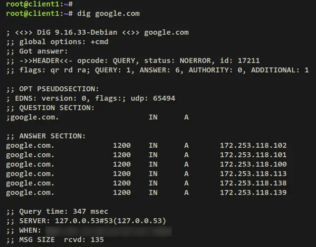 Move to the client machine and run the below command to access external/internet domain names via the dig command below.