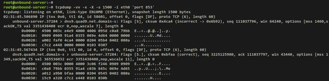 After that, move back to the Unbound server and you should now get an output similar to this on the tcpdump output.