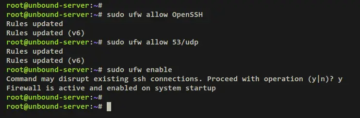 Next, run the below command to start and enable the UFW firewall service. When prompted, input y to confirm and press ENTER to proceed.