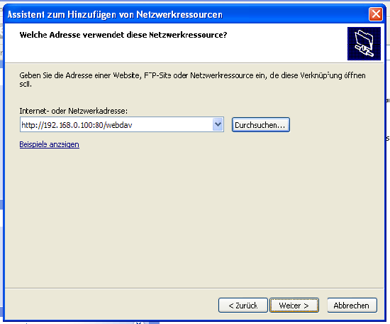 Enter http://192.168.0.100:80/webdav as the location and click on Next. You must specify the port in the WebDAV URL (:80). For some strange reason this makes Windows XP accept the normal username (e.g. test) - otherwise Windows XP expects NTLM usernames (that would have the form www.example.com\test).