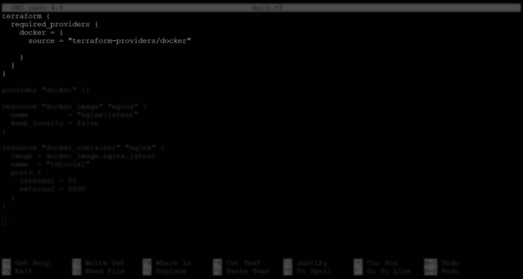- The resource "docker_image" "nginx" { code block demonstrates using the terraform CLI by creating a new resource called docker_image. The next line uses the docker-image to create a resource called nginx. You can infer that this will be used to manage your Docker container. The next line sets the name of your docker image as nginx:latest. The keep_locally = false prevents the image from being cached locally on your machine and is a good idea to prevent duplicated downloads.