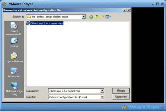 Now start your VMware Player (on Windows it's under Start -> Programs -> VMware -> VMware Player). A dialogue pops up where you are asked to browse to the location of the configuration file of your VMware image. Browse to the directory where you unzipped your image, and select the .vmx file: