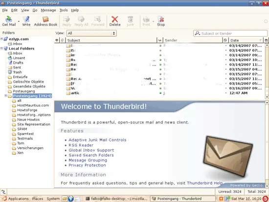 After you've copied over the directory, start Thunderbird on your Linux desktop. This makes sure that the directory .mozilla-thunderbird is created in your home directory (e.g. /home/falko/.mozilla-thunderbird) in case you haven't used Thunderbird on your Linux system before. If a wizard comes up and asks you questions, you can cancel them and close Thunderbird afterwards. The sole purpose of starting Thunderbird was to make it create the directory .mozilla-thunderbird in your home directory.