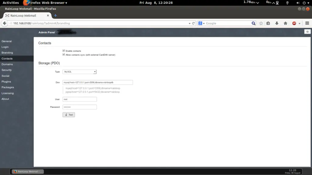 Here select the checkbox for Enable Contacts, Allow Contact Sync. Give the values of Mysql database as configured before at the time of database creation: