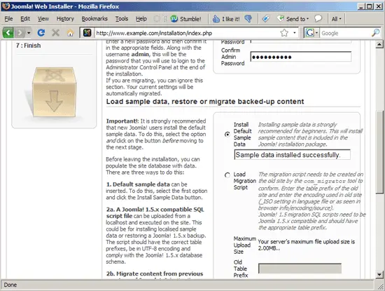 Click on Next after the sample data has been successfuly installed; you should see the final page of the installation wizard. It tells us to delete the installation directory...