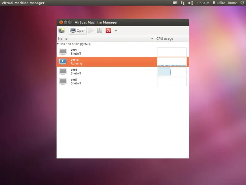 You should see vm10 as running. Mark that guest and click on the Open button to open the graphical console of the guest: