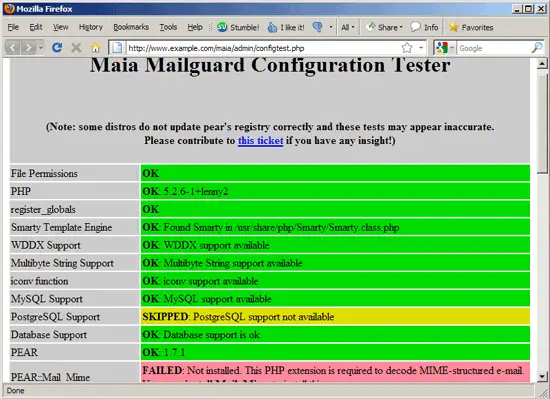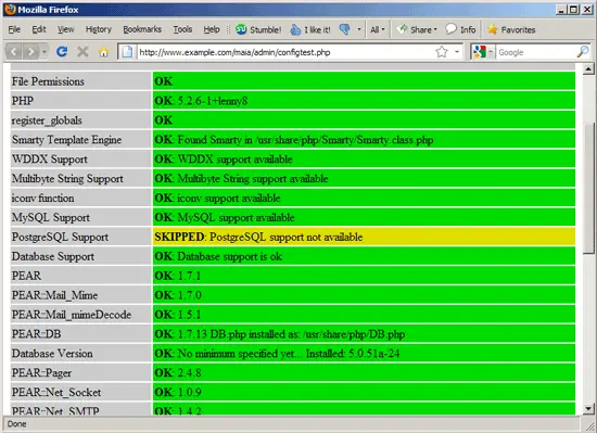 Now reload http://www.example.com/maia/admin/configtest.php - all required modules should now be installed: