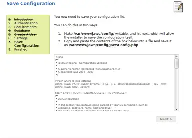 You can either do this manually, by copying and pasting the config into the "/var/www/jaws/config/JawsConfig.php" file which you could create using nano: