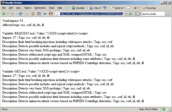 Now when you call that file in a browser, (e.g. http://192.168.0.100/phpids.php), you will see a blank page. But if you try to append some malicious parameters to the URL (e.g. http://192.168.0.100/phpids.php?test=%22%3EXXX%3Cscript%3Ealert(1)%3C/script%3E), PHPIDS will detect this and print its findings in the browser: