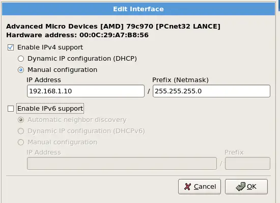 In the window that pops up uncheck Use dynamic IP configuration (DHCP) and Enable IPv6 support and give your network card a static IP address (in this tutorial I'm using the IP address 192.168.1.10 for demonstration purposes) and a suitable netmask (e.g. 255.255.255.0):