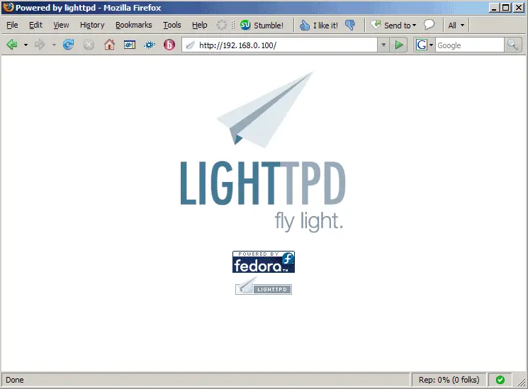 Now direct your browser to http://192.168.0.100, and you should see the Lighttpd placeholder page: